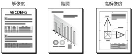 [解像度]よりも高精細な印刷を行うことができますが、質感の安定性は若干劣ります。文字や細い線のデータ、CADデータなどの輪郭をシャープにプリントするのに適しています。