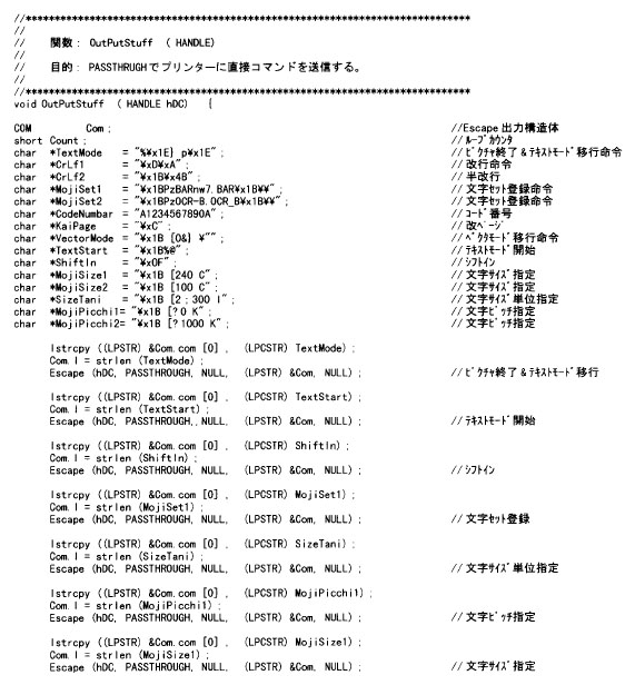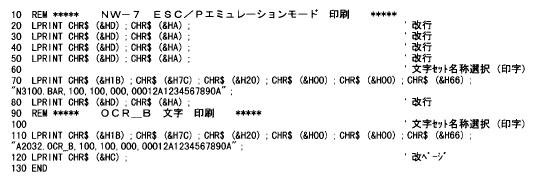 LIPSモードで、「A1234567890A」のNW-7のバーコードとOCR_B文字でコード番号を印刷する場合。(メインプログラムは「VC++用共通サンプルメインプログラム」を参照)