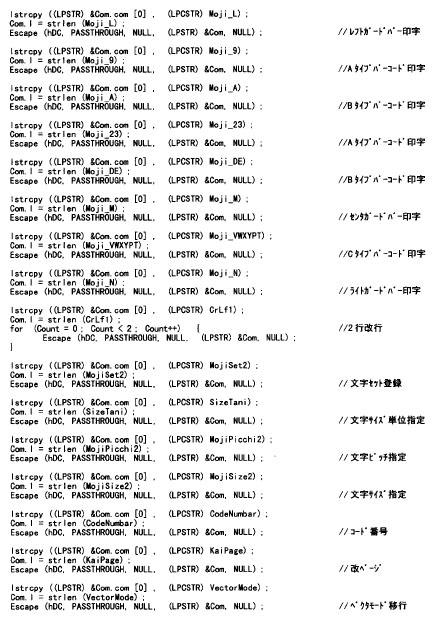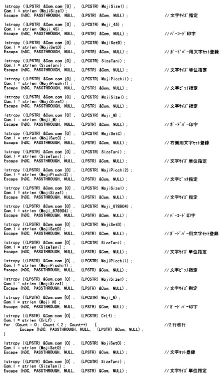 LIPSモードで、文字コードの置換による方法でJAN13桁のバーコードとOCR_B文字でコード番号を印刷する場合。(メインプログラムは「VC++用共通サンプルメインプログラム」を参照)