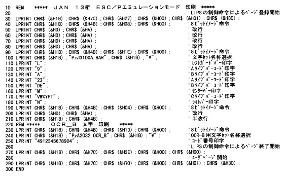 ESC/Pのエミュレーションモードで、3ドットモジュール、高さ100ドットの文字コードの置換による方法でJAN13桁のバーコードとOCR_B文字でコード番号を印刷する場合。