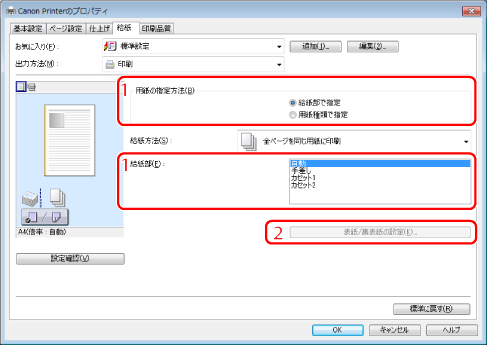 特定の用紙に印刷したい場合、その用紙がセットされている給紙部、またはその用紙種類を指定します。
