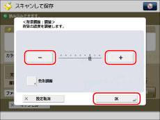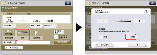 <背景調整>で[調整]を押して調整値を変更すると、[自動]の設定は解除されます。また、[調整]で濃度調整をしているときに[自動]を押すと、調整値は解除され、下地の画質を自動的に調整します。