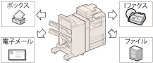 スキャナー部で取り込んだ紙文書を、Eメール、Iファクスを利用して他の人に配布できます。文書のやりとりが効率的になります。また、Eメールや、FTP、SMB、WebDAVなどのファイルサーバーに送信すると、紙文書が電子化されるので、コンピューターでの閲覧やデータ管理にご利用いただけます。