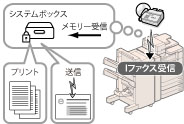 受信したIファクス文書をプリントせずに、システムボックスに保存するように設定できます(メモリー受信)。システムボックスにメモリー受信された文書は、相手先やページ数などの詳細情報を確認したあと、好きなときにプリントしたり、別の宛先に再送信したりできます。