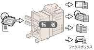 あらかじめ設定した条件に一致するIファクス文書を、指定の宛先に、お好みの送信設定で転送できます。また、受信したIファクス文書を他の機器に転送する「中継」や、転送先に任意のファクスボックスを指定する「親展」が可能です。タイマーを設定して転送設定が有効になる時間を指定することもできます。さらに、本製品では、条件に一致しなかったIファクス文書の転送先も指定しておくことができるので、受信した文書の仕分け配信機能として利用できます。