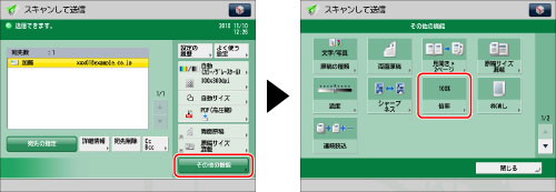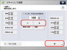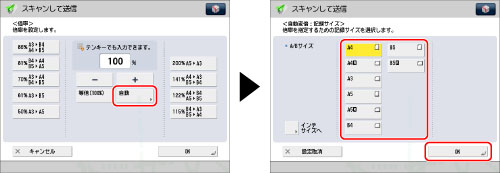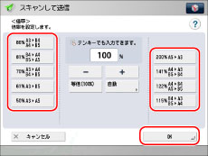 ファイル形式にPDF(高圧縮、アウトライン、OCR)、XPS(高圧縮、OCR)、OOXMLを設定した場合は、倍率は[等倍(100%)]または[自動]でのみ送信できます。