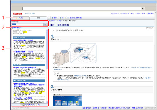 トップページ上部またはトピックページの検索エリアにある入力欄に文字を入力して、 をクリックすると、検索結果が表示されます。また、2つ以上の語句を入力して検索結果を絞り込むこともできます(AND検索)。その場合、語句と語句の間にはスペースを入れてください。 例:「トナー メッセージ」(「トナー」と「メッセージ」の両方の語句が含まれるページを表示させたいとき) ダブルクォーテーション("")で語句を括ると、フレーズ検索になります。