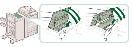 ホチキスを設定してプリントしていた場合、ホチキスされる前の出力紙の束は取り除かないでください。(紙づまりを処理したあと、続きから出力されます。)