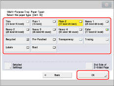 To print on the backside of preprinted paper, load the paper into the multi-purpose tray, and press [2nd Side of 2-Sided Page] on the paper selection screen that appears.