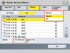 To print the reception history for the Fax Activity Report, select [Fax] in the drop-down list. (See "FAX ACTIVITY REPORT TX/RX.")