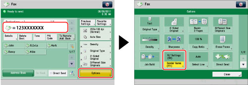 Specify the destination → press [Options] → [Sender Name (TTI)].