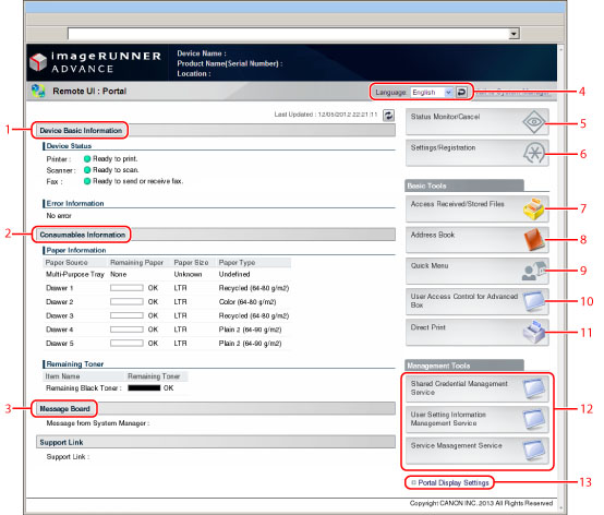 You can change the language displayed on the screen by selecting the desired language on the portal page, regardless of the language used on the touch panel display of the machine.