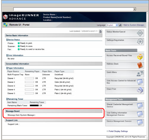 If you select [Display on Portal], the message board is displayed on the portal page of the Remote UI.