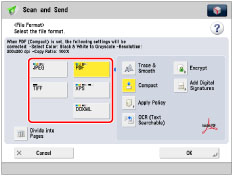 You can select additional settings if you send in the PDF, XPS or OOXML format. Refer to the following for instructions on setting each type of PDF, XPS, or OOXML: