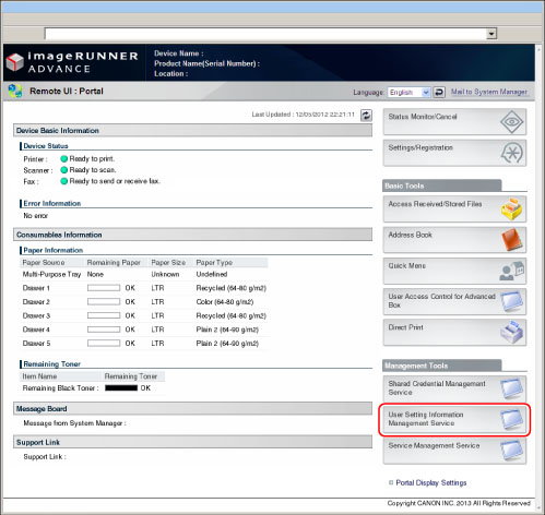 To specify each setting for User Setting Information Management Service, it is necessary to access and then log in to the machine from the Web browser. This section describes the procedure for accessing the machine from the portal page of the Remote UI.