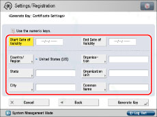 It is necessary to generate and register a key pair in order to perform the following: To use encrypted SSL communication for IPP printing, e-mail and I-faxes, the Remote UI, MEAP functions via a Web browser, device information delivery, and the Advanced Space which is opened externally as a WebDAV server; to use the SMS management function of MEAP; and, to confirm Department IDs and PINs.