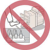 If you put weight on the front of the machine while the drawers, paper decks, or units within the machine are pulled out, the machine may fall forward. To prevent this from happening, make sure that the machine's leveling feet are in place.