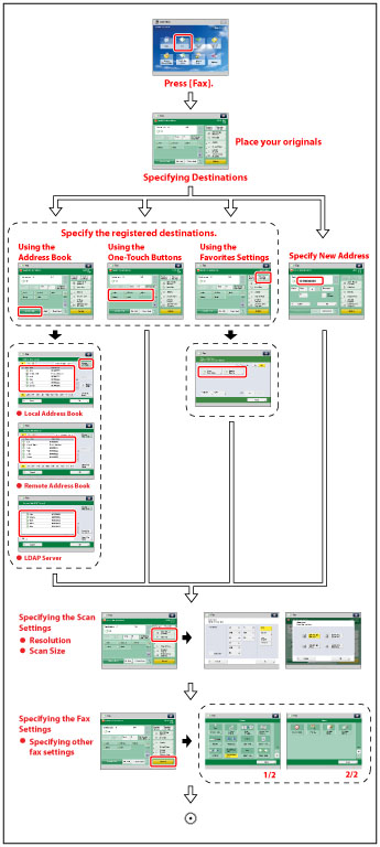Press to set useful fax functions such as sending different sized originals together or 2-sided originals.