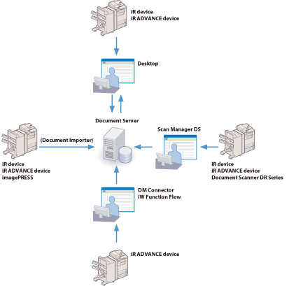Documents imported with iW Scan Manager DS can be released to "Document Server," which is the core iW series software product utilised in various business situations.