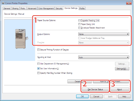 You can obtain device information and update the settings displayed in the sheet (see "Setting the Printer Options").