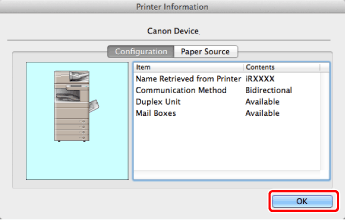 If the printer driver name displayed at the top of the [Printer Information] dialog box and the printer name displayed as [Name Retrieved from Printer] do not correspond correctly, you may not be able to use the printer functions correctly. If the names do not correspond, delete the printer you have added in [System Preferences] and add it again. For details, see the Printer Driver Guide (see " Installation").