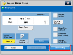 If you want to print a file stored in the machine from a computer or using [Store in Mail Box] of the Copy function with the settings that were set when the file was stored, do not print the file from the Change Print Settings screen. If you print the file from the Change Print Settings screen, the file may not be printed with the same settings that were set when the file was stored.