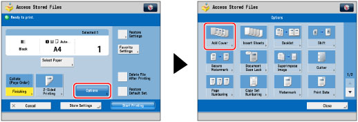 If you select [Print on Front Side], [Print on Back Side], or [Print on Both Sides] for the front and/or back cover, the machine inserts a sheet of paper from the paper source that you selected in step 3 to be used as the print's front and/or back cover. The machine then prints on the front side, back side, or both sides of the front and/or back cover.