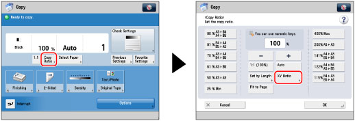 If you set the copy (zoom) ratio in [XY Ratio], the image of the original may be rotated before being printed. The machine calculates whether or not to do this based on the original size and the specified copy (zoom) ratio.
