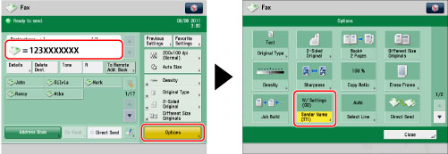 Specify the destination → press [Options] → [Sender Name (TTI)].