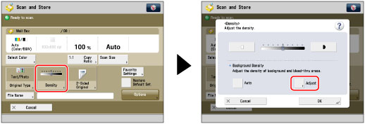 If you adjust the background density by pressing [Adjust] for <Background Density>, the [Auto] setting is cancelled. Similarly, if you press [Auto] while making manual adjustments in [Adjust], your adjustments are cancelled. The machine automatically adjusts the density to match the background.