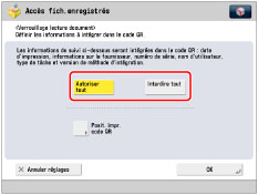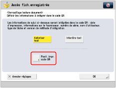 Avant le réglage de cette fonction, l'administrateur doit configurer l'utilisation du code QR pour le mode Verrouillage lecture document. (Voir "Sélection du code pour le verrouillage de la lecture de documents (Code TL/Code QR)".)