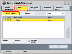 Le rapport Envoyer liste des tâches comprend une liste des transmissions de type télécopie, e-mail, I-Fax, serveur de fichiers et boîte aux lettres.