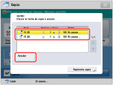 Si l'on appuie sur [Annuler] dans l'écran qui apparaît pendant la copie ou en mode d'attente, il est possible d'annuler la tâche en cours de copie, ou la dernière tâche pour laquelle un original a été lu et qui est en attente de copie.