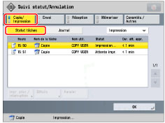 L'écran Suivi statut/Annulation de l'imprimante en tandem permet d'annuler une tâche de copie en tandem. Dans ce cas, la copie en tandem en cours n'est pas annulée.