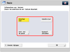La copie des sorties est limitée. On peut régler la restriction Authentif. utilisateur si la gestion des numéros de service ou l'authentification pour SSO-H sont définies. La copie n'est possible que si la gestion des numéros de service ou le nom de l'utilisateur correspondent.