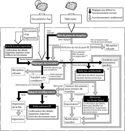 *1 Si la sous-adresse et le mot de passe attachés au fichier reçu correspondent aux informations enregistrées dans [Réglages de transfert], les fichiers sont transférés à leurs destinataires de transfert quel que soit le réglage du mot de passe de réception.