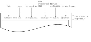 Si la machine est réglée pour que ces informations soient imprimées sur l'en-tête des documents envoyés, et si certains éléments n'ont pas été enregistrés, seuls les éléments enregistrés et le nombre total de pages s'impriment sur l'en-tête.