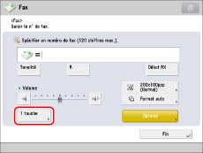 Il est possible de sélectionner un bouton de composition 1 touche pour spécifier un numéro de téléphone ou de fax. Pour plus d'informations sur les boutons de composition 1 touche, voir "Spécification d'un destinataire à l'aide des boutons de composition 1 touche".