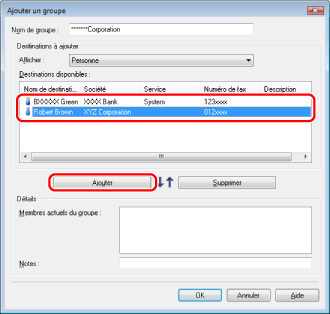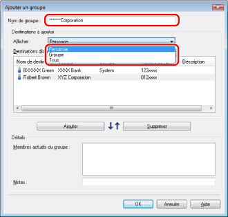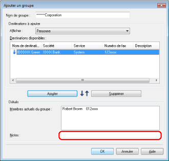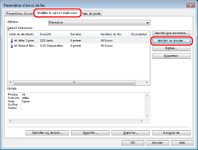Il est également possible de modifier les données de groupes destinataires précédemment enregistrés. Pour plus d'informations, cliquer sur [Aide] dans l'angle inférieur droit de la fenêtre du pilote de télécopie pour afficher l'aide en ligne.
