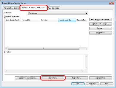 Il est possible de télécharger les données de fichiers CSV (*.csv) ou de fichiers Carnet d'adresses Canon (*.abk) dans le carnet d'adresses.