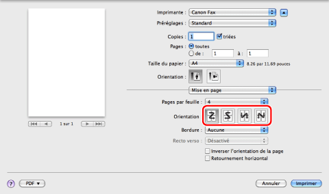 Sélectionner le télécopieur utilisé → [Mise en page] → définir le nombre de pages à reproduire sur une seule feuille dans [Pages par feuille].
