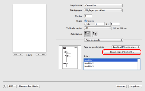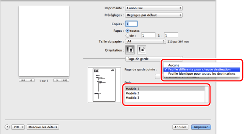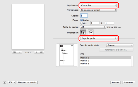 Sélectionner une option pour l'ajout d'une page de garde dans [Page de garde jointe] → sélectionner un modèle de page de garde dans [Style].