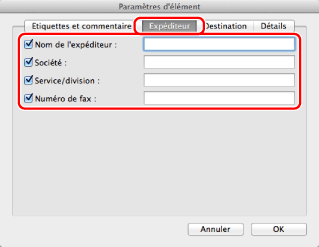Cliquer sur [Expéditeur] → sélectionner les éléments relatifs à l'expéditeur qui devront être imprimés sur la page de garde → saisir les données.