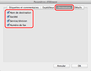 Cliquer sur [Destination] → sélectionner les éléments relatifs au destinataire qui devront être imprimés sur la page de garde.