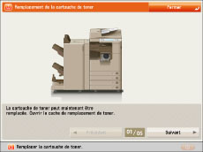 Pour obtenir des instructions détaillées relatives au remplacement de la cartouche de toner, appuyer sur [Précédent] ou [Suivant] sur l'afficheur tactile.