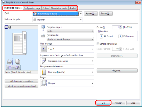 Sous l'onglet [Réglages de base], [Recto/Recto verso/Brochure] a pour valeur par défaut [Impression recto verso]. Pour plus d'informations, voir "Impression recto et recto verso".