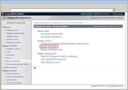 Il est également possible de spécifier les réglages de transfert depuis le panneau de commande de la machine en appuyant sur [Réglages de fonction] (Réglages/Enregistrement) → [Recevoir/Transférer] → [Réglages communs] → [Réglages de transfert]. Pour plus d'informations sur l'utilisation du panneau de commande pour définir les réglages de transfert et sur les réglages proprement dits, voir "Recevoir/Transférer".