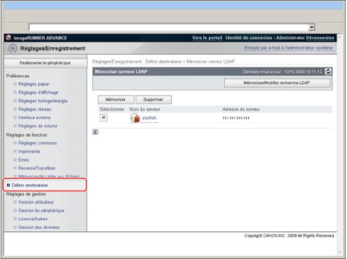 → [Définir destinataire] → [Mémoriser serveur LDAP]. Pour plus d'informations sur l'utilisation du panneau de commande pour définir les réglages LDAP, voir "Réglages des serveurs LDAP".Pour spécifier les réglages du serveur LDAP, il est nécessaire de se connecter en tant qu'administrateur.