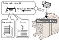 Il est possible de régler la machine pour qu'elle enregistre les documents reçus par I-Fax dans la boîte mémoire RX, au lieu de les imprimer. Les informations concernant l'émetteur et le nombre de pages de chaque document peuvent être consultées avant l'impression ou le transfert à un autre destinataire.