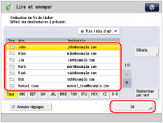 Pour envoyer une indication de fin de tâche, il est nécessaire d'enregistrer les adresses e-mail dans le carnet d'adresses local ou sous un bouton de composition 1 touche au préalable. (Voir "Mémorisation d'une adresse électronique".)